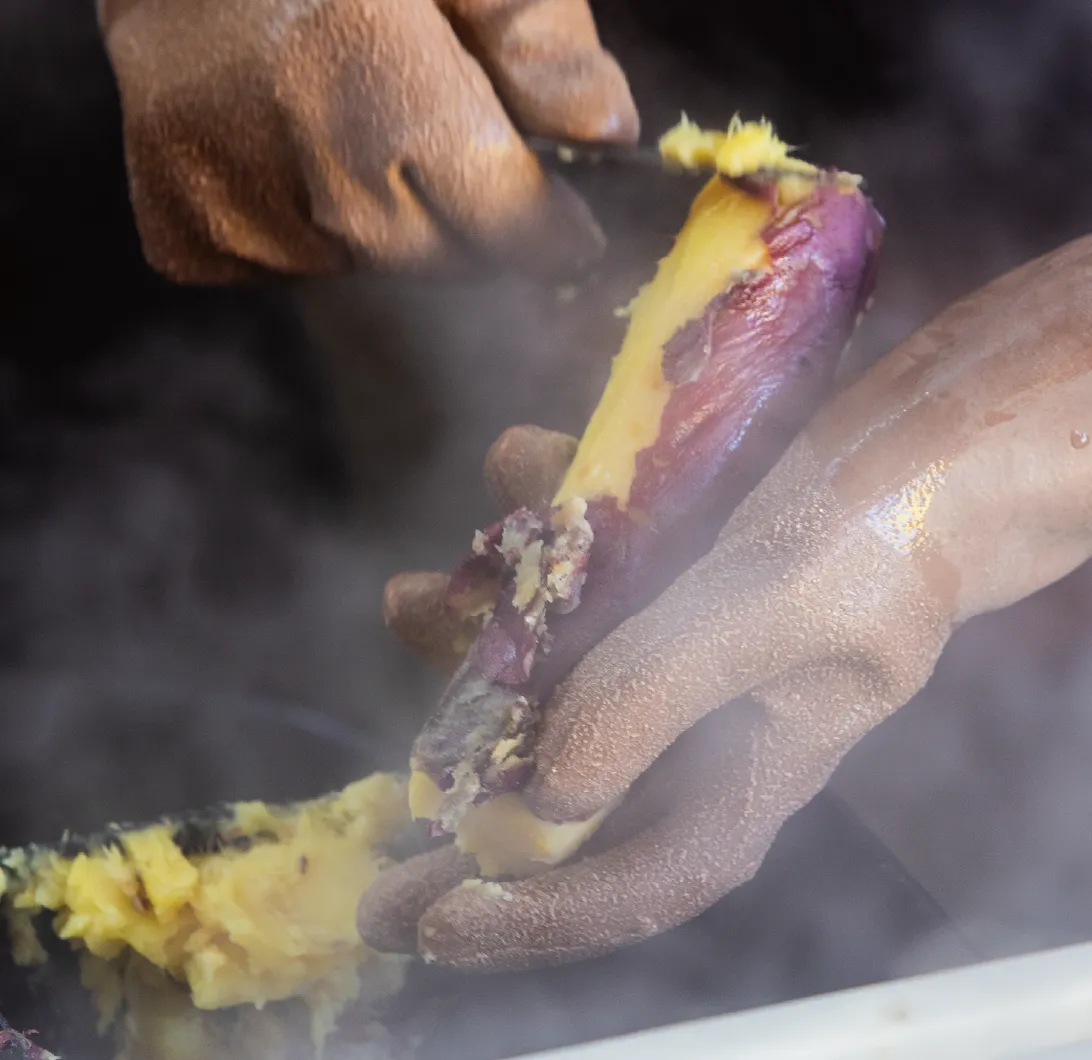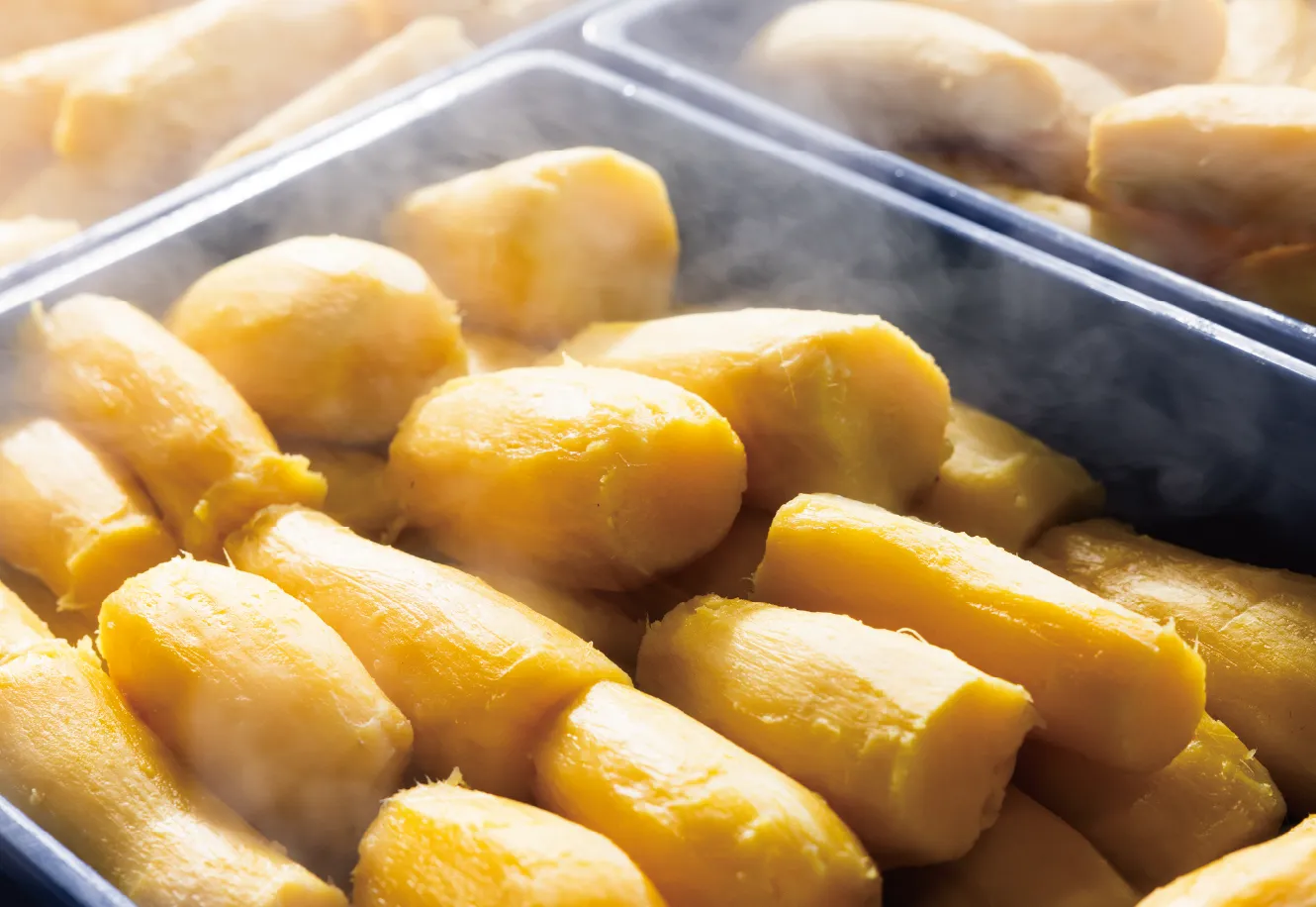 大きさが近いさつまいもを選別し、揃えて並べ、じっくりと蒸し上げます。湯気に包まれたいもがやわらかくなる頃、でんぷんが糖へと変わっていきます。甘さの土台をつくる、大切な工程です。