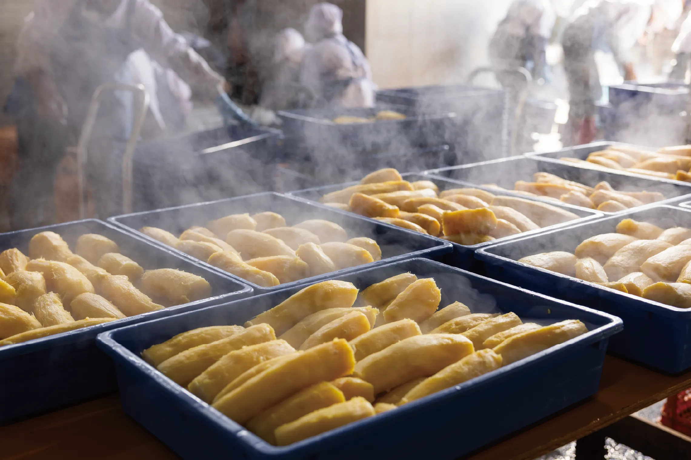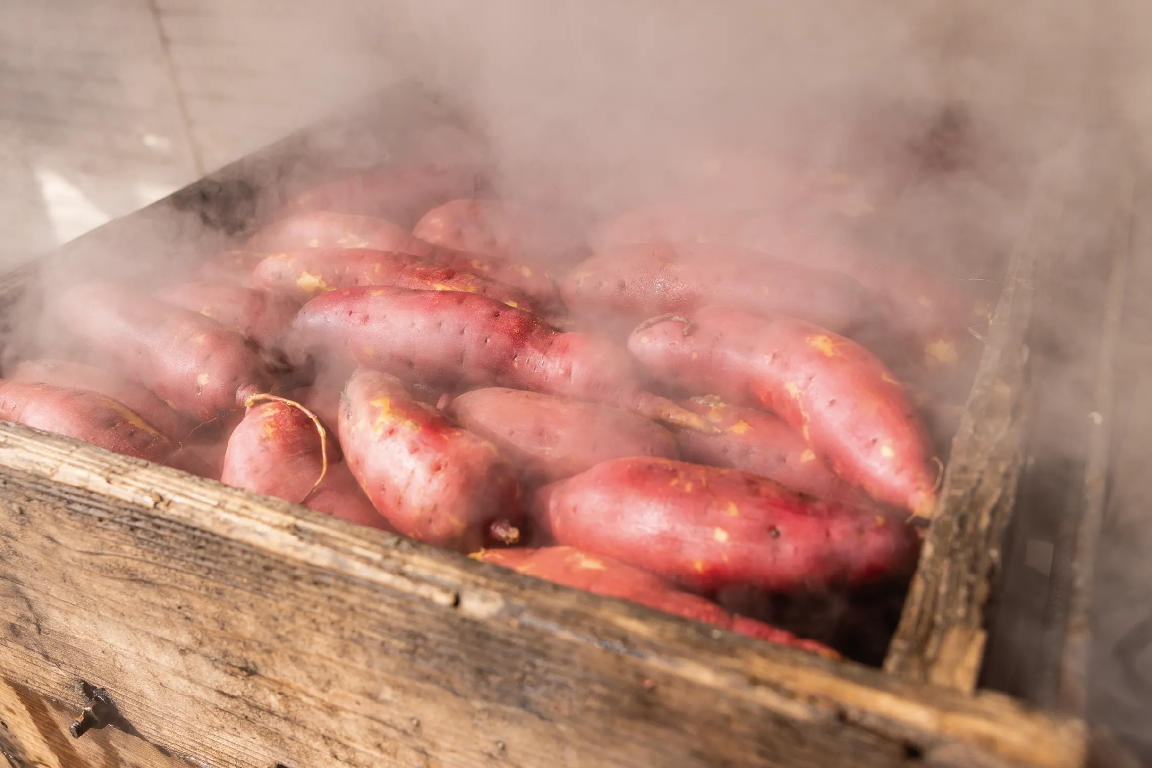 大きさが近いさつまいもを選別し、揃えて並べ、じっくりと蒸し上げます。湯気に包まれたいもがやわらかくなる頃、でんぷんが糖へと変わっていきます。甘さの土台をつくる、大切な工程です。