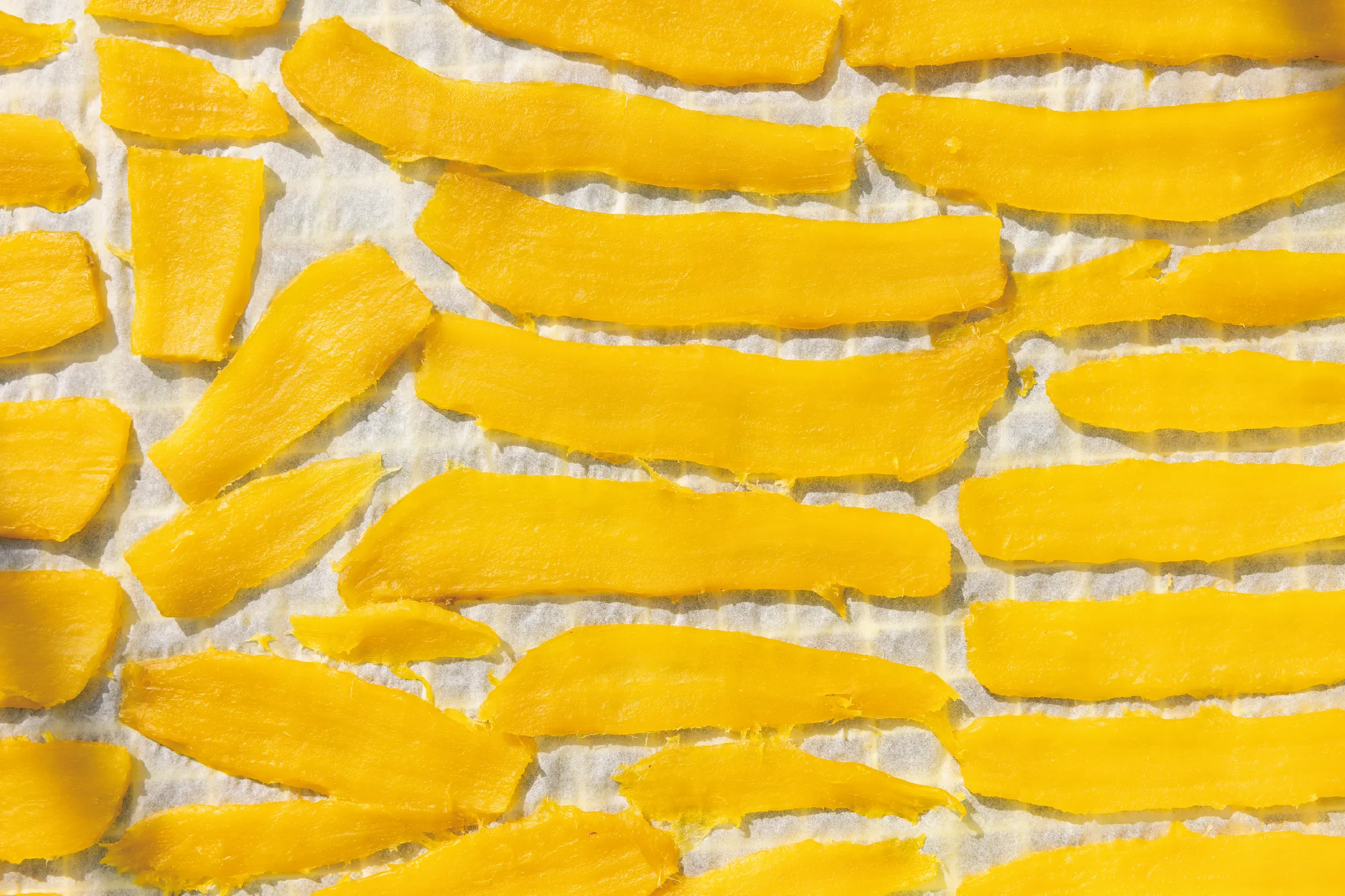 繊維の向きを見極めながら、厚みを揃えて丁寧に切り分けます。厚すぎず、薄すぎず。乾燥後の食感まで思い描きながら刃を入れる、仕上がりを左右する瞬間です。