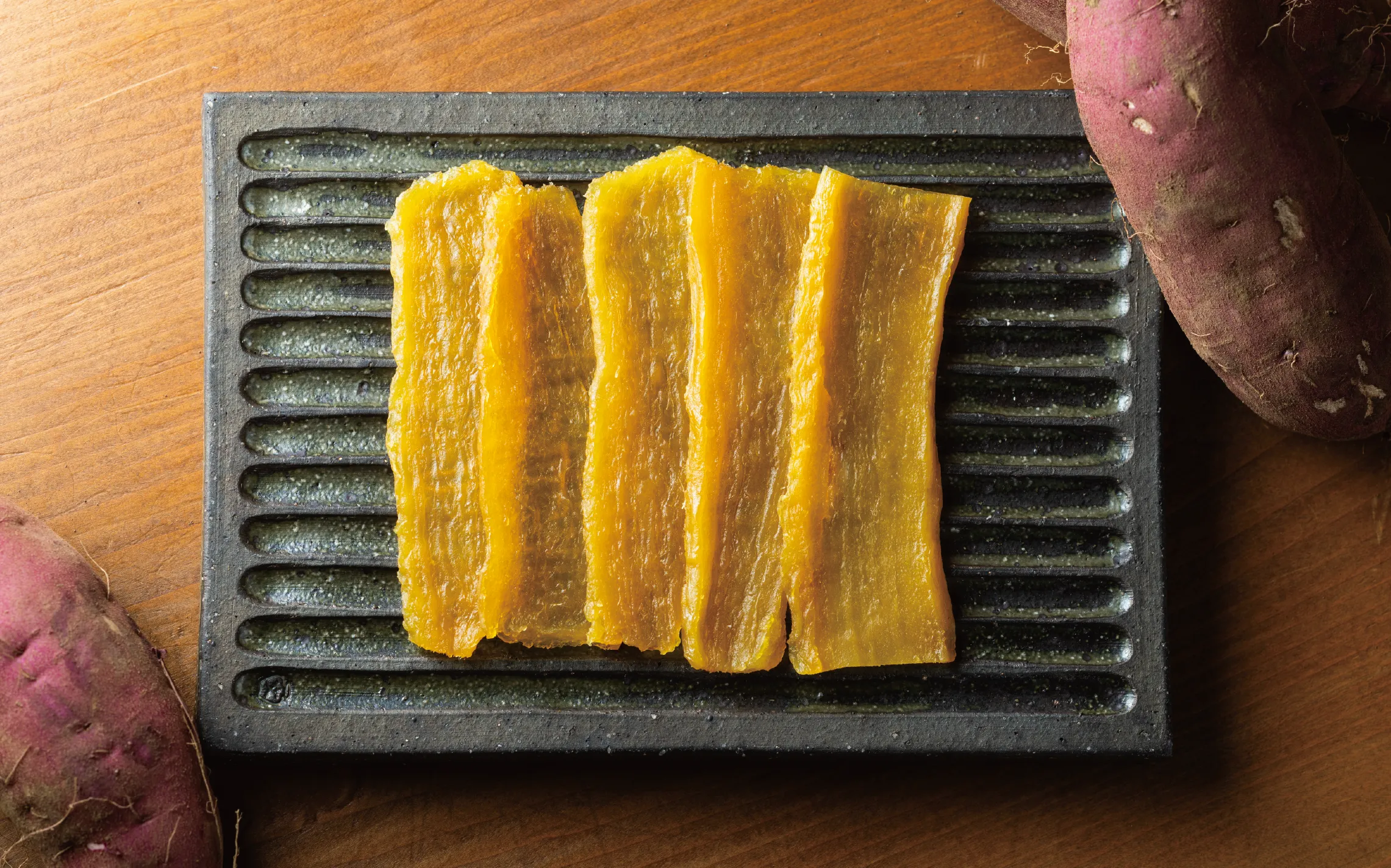 蒸したさつまいもを1本丸ごと天日干ししています。スライスしたものと比べ時間と手間がかかり生産量は少ないですが、芋の甘さ、ねっとりとした独特の食感と風味は数ある干し芋の種類の中でも1番です。